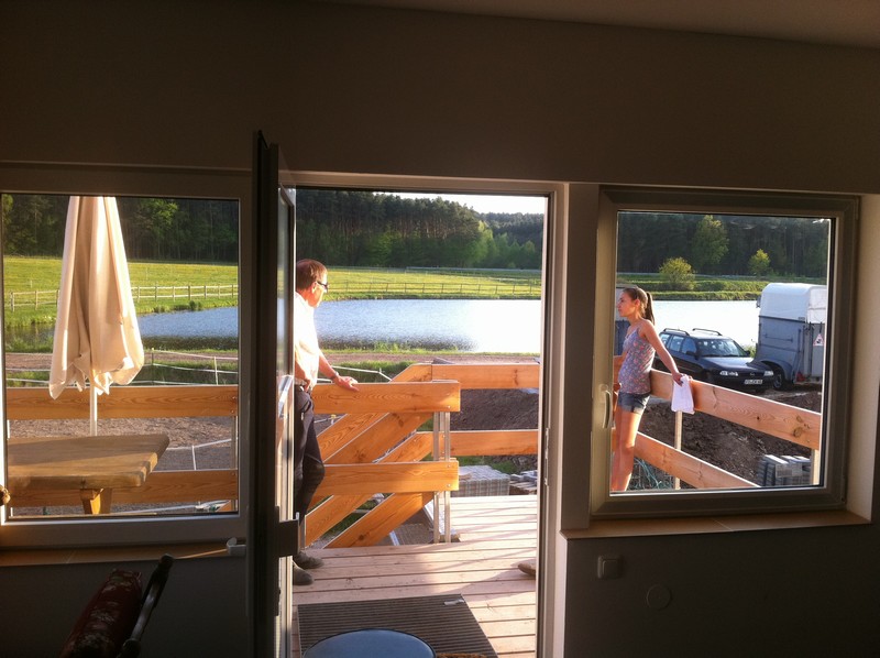 - Reiterstübchen mit Terrasse, Blick in die Halle und auf Außenplatz u. Koppeln